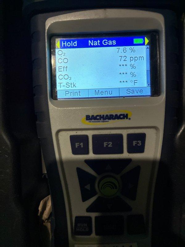 Performed routine heating maintenance service on residential system. Conducted combustion analysis with Bacharach analyzer showing Oâ‚‚ at 7.6% and CO at 72 ppm, indicating system is functioning but may need minor adjustment to optimize efficiency. Complete inspection confirmed system operational for heating season.