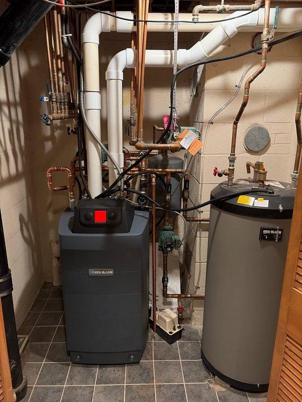 Successfully completed replacement of existing boiler with new Weil-McLain unit in residential mechanical room. Installation included integration with existing PVC venting system and copper supply/return piping. System was properly connected, tested for proper operation, and left with control panel functioning.