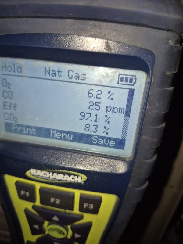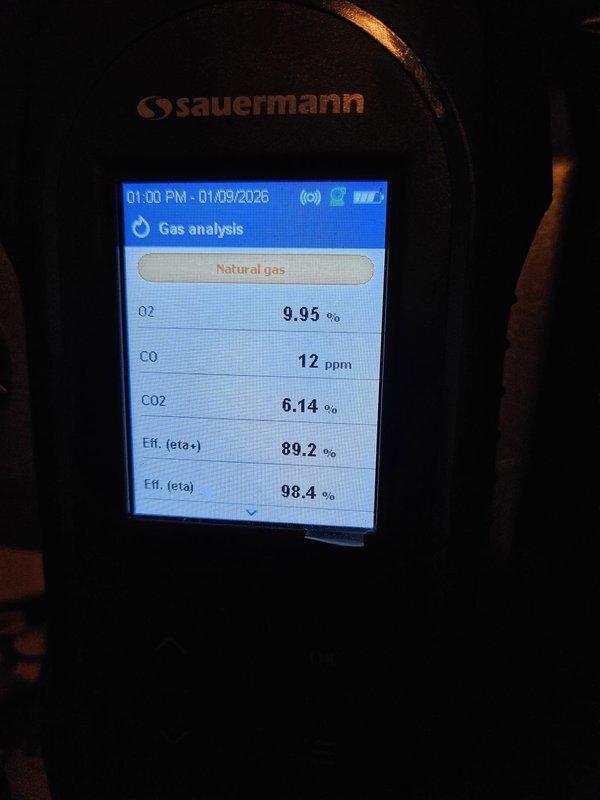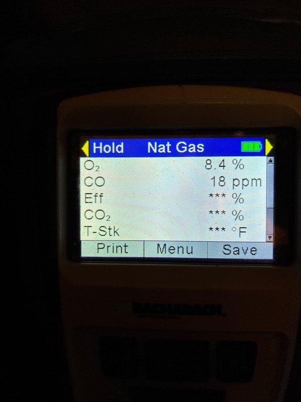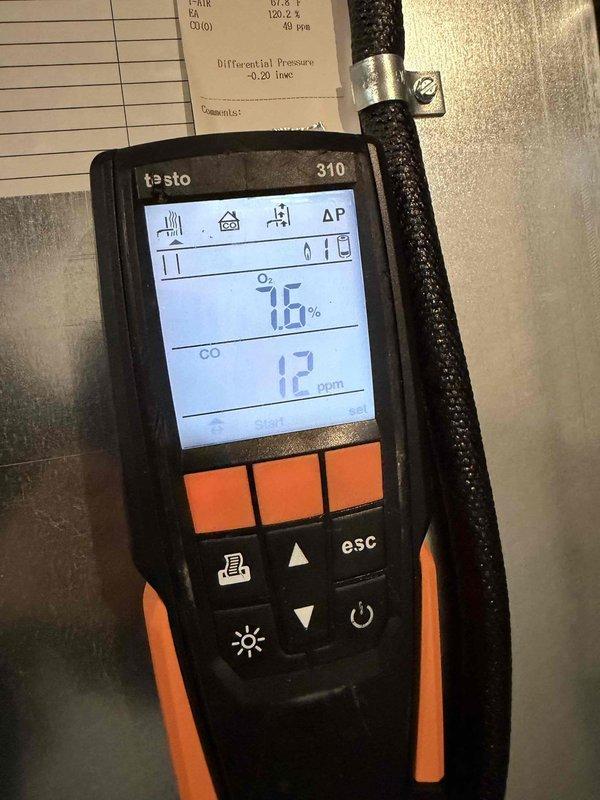 Performed routine maintenance on 12-year-old residential furnace. Conducted combustion analysis using Testo 310 analyzer, confirming proper oxygen levels at 8.0% and safe carbon monoxide readings of 9-14 ppm, indicating efficient operation within manufacturer specifications.