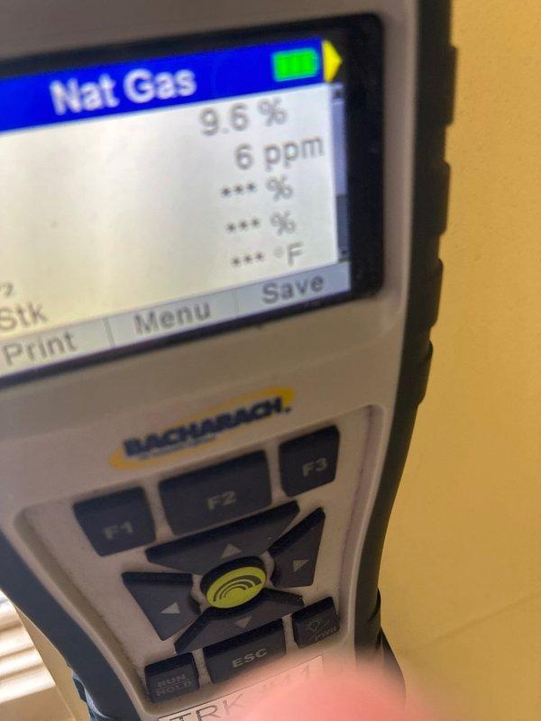 Conducted routine maintenance on two residential furnaces. Performed leak detection checks using Bacharach gas analyzer which detected presence of natural gas at 6 ppm with 9.6% concentration. Testing completed to ensure safe system operation.