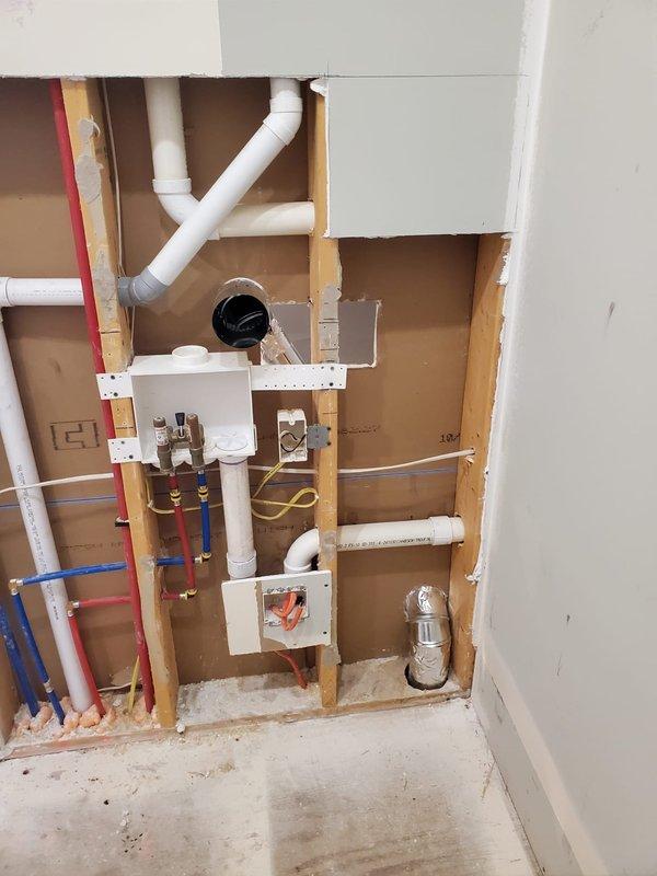 Met with customer and completed rework of return duct in the washer/dryer room. Accessed wall section to modify existing plumbing infrastructure, including proper routing of PVC drain connections and color-coded water supply lines (red/hot, blue/cold). Ensured proper installation of valve box and all plumbing fittings according to new construction specifications.