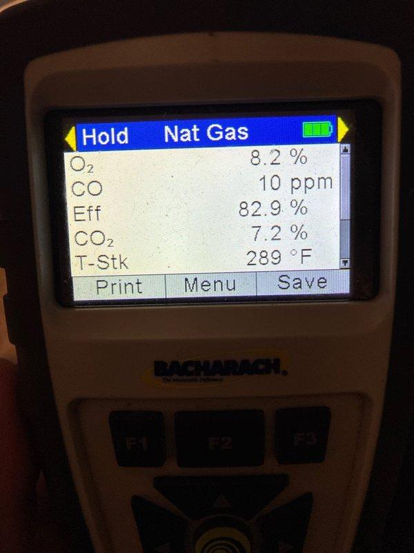 Completed routine furnace maintenance service on natural gas heating system. Performed combustion analysis using Bacharach analyzer, confirming system is operating within acceptable parameters (82.9% efficiency, 10ppm CO, 7.2% CO2, 289°F stack temperature).
