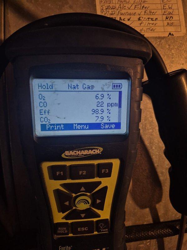 Performed emergency service to replace failed gas valve on 15-year-old furnace. Conducted post-installation combustion analysis with Sauermann analyzer, confirming proper operation with O2 at 10.38%, CO at 2 ppm, CO2 at 5.92%, and efficiency readings of 88.8% (eta+) and 98.0% (eta).