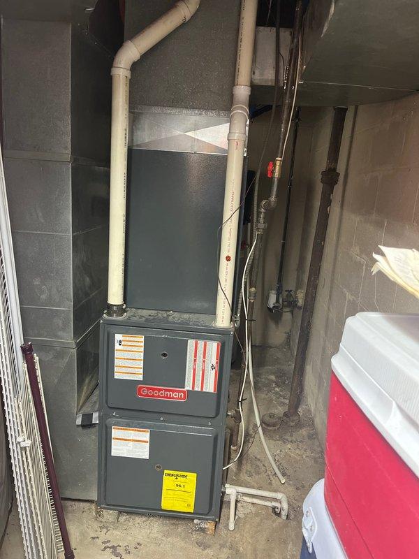 Completed assessment for full system replacement, documenting existing Goodman furnace installation with PVC venting in utility area. Evaluated current setup including eliminated returns and potential zoning opportunities. System is installed against concrete block walls with standard ductwork connections; will provide comprehensive replacement options based on inspection findings.