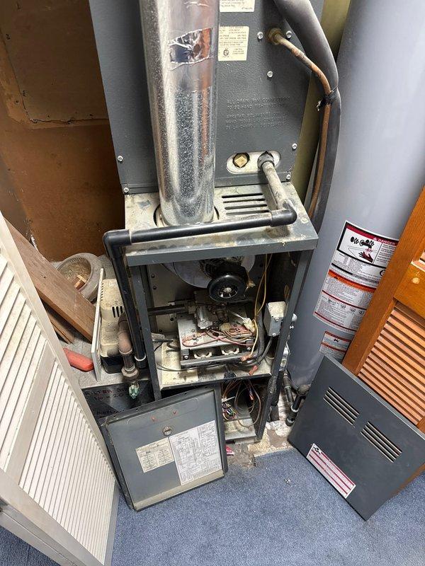 Performed diagnostic assessment of non-functioning heating system. Recommended complete replacement of existing furnace and A/C unit due to failure. Conducted site evaluation in utility room where current furnace is installed adjacent to water heater and laundry equipment. Documented existing ductwork configuration and available space for new system installation.
