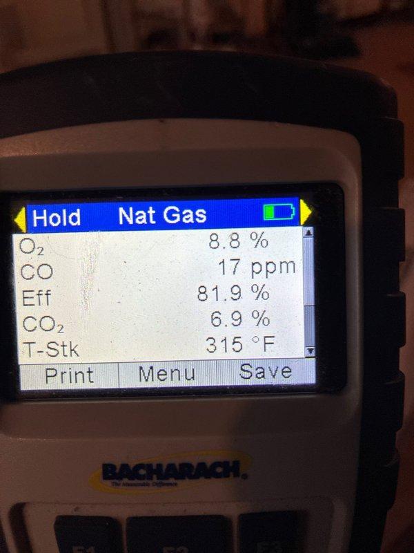 Performed routine furnace maintenance service including combustion analysis with digital gas analyzer. Testing revealed system operating at 81.9% efficiency with CO levels at 17ppm, Oâ‚‚ at 8.8%, COâ‚‚ at 6.9%, and stack temperature of 315°F. All readings within acceptable parameters for natural gas furnace operation.