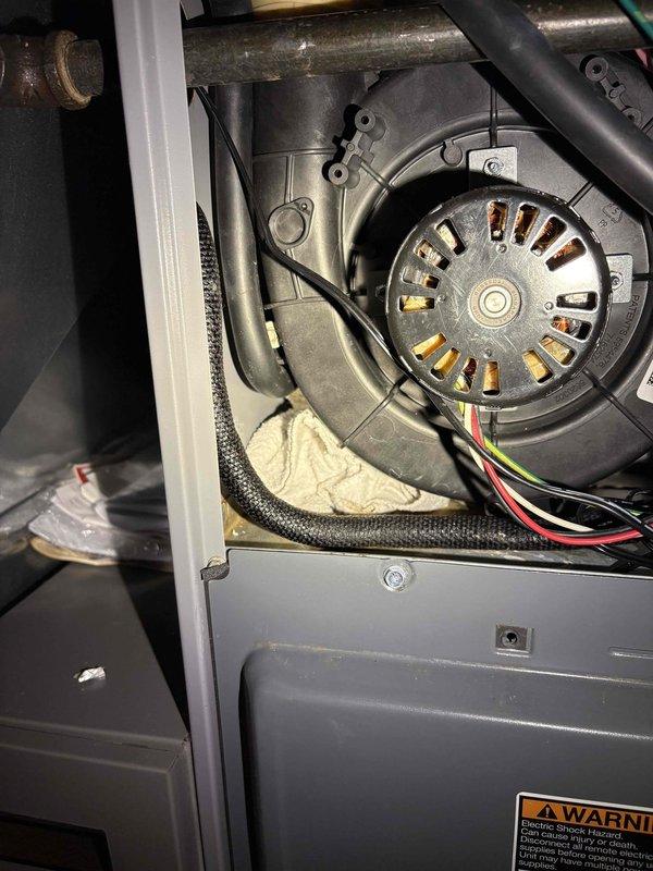 Performed scheduled maintenance on commercial furnace system. Inspected blower motor assembly, electrical connections, and flexible ducting for proper operation. Documented system condition with photos showing the blower wheel, motor housing, and associated components all functioning within normal parameters.