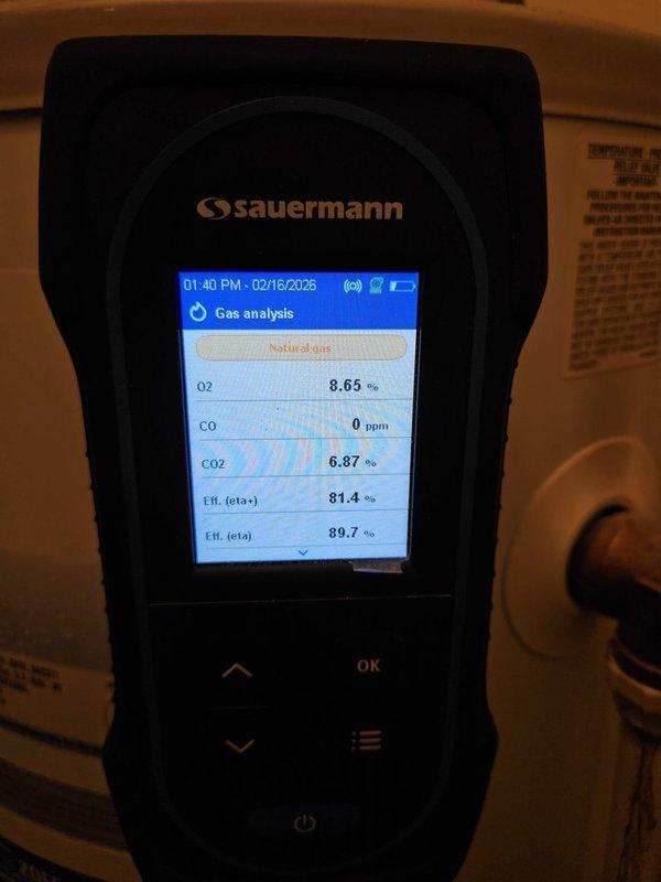 Responded to service call for furnace making loud, unusual noise during startup. Performed combustion analysis on natural gas system with Sauermann analyzer, confirming proper operation with O2 at 8.65%, CO at 0ppm, CO2 at 6.87%, and efficiency readings of 81.4% (eta+) and 89.7% (eta).