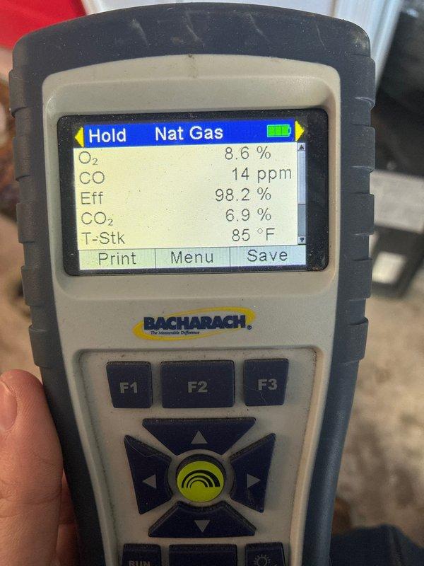Performed combustion analysis on natural gas furnace using Bacharach analyzer, confirming optimal operation with 98.2% efficiency, acceptable O2 levels at 8.6%, CO at safe 14 ppm, CO2 at 6.9%, and normal stack temperature of 85°F.