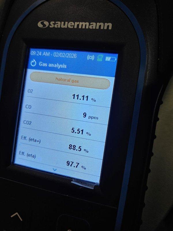 Performed annual preventative maintenance on natural gas furnace as part of MVP membership. Conducted combustion analysis using Sauermann gas analyzer, confirming system is operating at 88.5% efficiency (eta+) with acceptable oxygen levels at 11.11% and minimal carbon monoxide production (9 ppm). System efficiency parameters are within normal operating range.