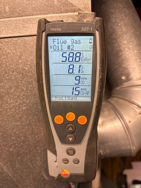 Performed standard heating maintenance service on residential system. Conducted combustion analysis using Testo 310 gas analyzer, which recorded oxygen (Oâ‚‚) level at 7.5% and carbon monoxide (CO) readings between 26-41 ppm, indicating proper combustion efficiency within acceptable safety parameters.