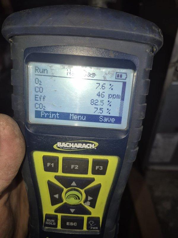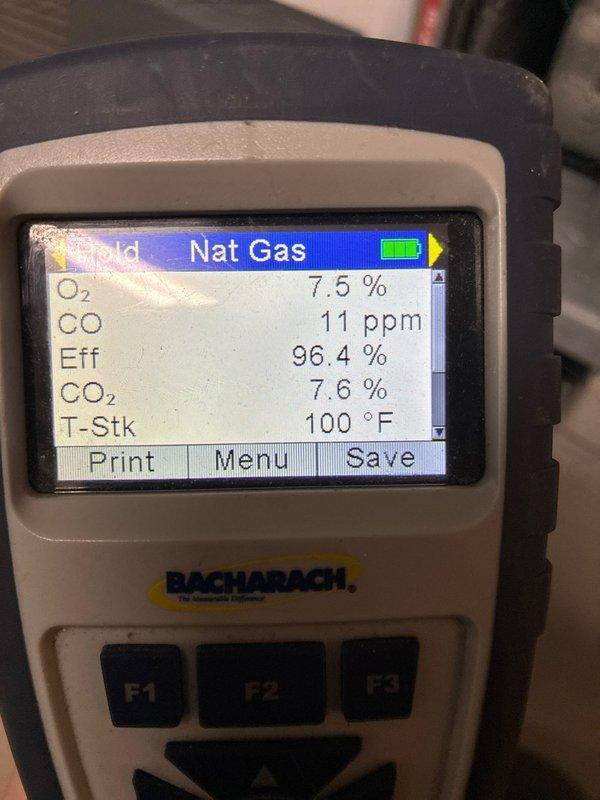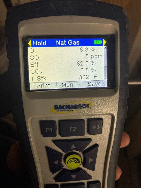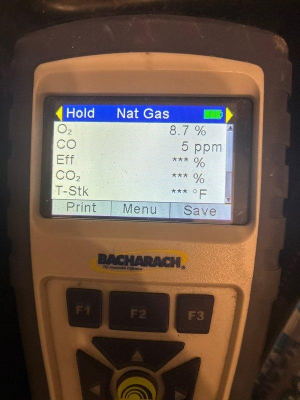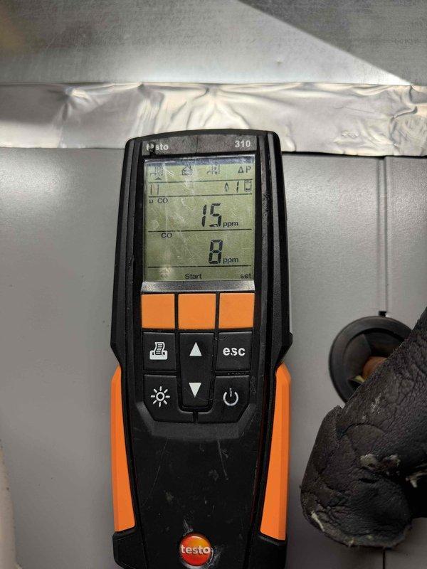 Performed annual maintenance on 12-year-old furnace. Conducted combustion analysis with Testo 310 gas analyzer, confirming CO levels at 1.5 ppm and 0 ppm, which are within safe operating parameters.