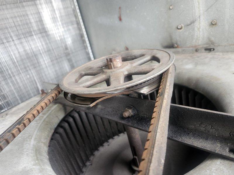 Conducted comprehensive evaluation of 6 RTUs as requested. During inspection, documented belt drive system on one unit showing signs of wear with visible dust accumulation and slight corrosion on the pulley mechanism. Visual assessment indicates routine maintenance may be required to address potential belt system deterioration.