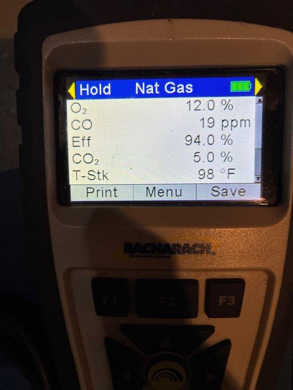 Performed complete furnace tune-up with combustion analysis showing optimal efficiency (94.0%) with acceptable CO levels (19ppm) and proper stack temperature (98°F). System is operating within manufacturer specifications, though unit will require replacement part #11-1 during next scheduled maintenance.
