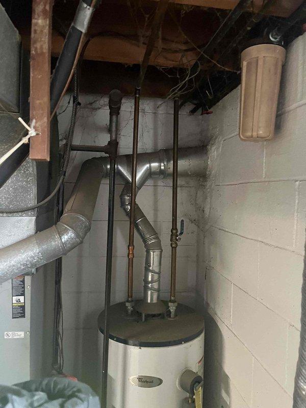 Performed assessment at rental property for "No Heat" complaint. Inspected utility area containing Whirlpool water heater with connected galvanized ductwork and piping. Evaluation revealed heating system requires full replacement due to extensive deterioration of components and inefficient operation. Tenant was present during inspection and documentation of system condition was completed via photographs.