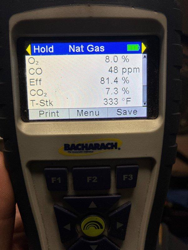 Responded to no-heat call for gas furnace. Diagnosed ignition failure preventing burner operation. Performed combustion analysis after repairs with readings of 8.0% Oâ‚‚, 48 ppm CO, 7.3% COâ‚‚, and 333°F stack temperature, achieving 81.4% efficiency. System now operating properly with verified safe operation.
