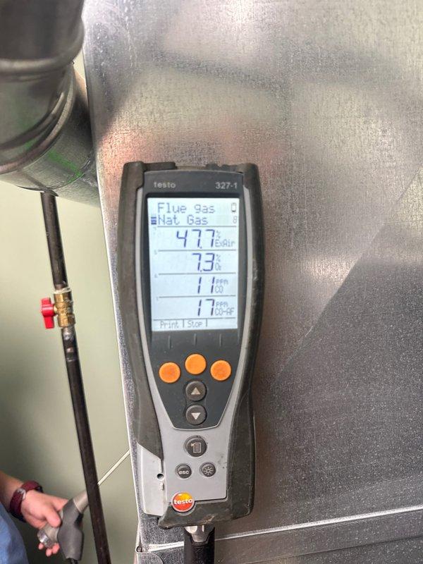 Responded to service call for gas furnace with CO2 detector alarm following battery replacement. Performed combustion analysis using Testo 310 analyzer, measuring oxygen levels at 10.7% and flue temperature at 54°F, indicating furnace was not operating at time of test. Further diagnostics required to determine if CO alarm was false alert from battery change or actual combustion issue requiring system evaluation and safety testing under operating conditions.