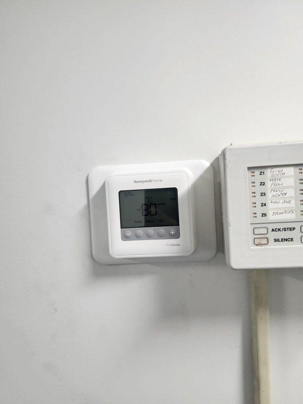 Responded to service call for non-operational air conditioning system with thermostat indicating active cooling mode but no unit response. Performed diagnostic inspection of Honeywell TH-Series thermostat and verified display functionality, then traced control circuit to outdoor condensing unit to identify communication failure between thermostat and compressor. Restored cooling operation and confirmed proper system function with adequate airflow and temperature reduction.