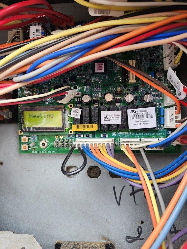 Successfully diagnosed malfunctioning HVAC system and replaced defective control board (Source 4 G163819129_R4) that was preventing proper heating operation. Reconnected all wiring terminals (including red, yellow, blue, orange, white, black, and purple wires) to their designated connection points on the new circuit board, and verified system functionality through operational testing.