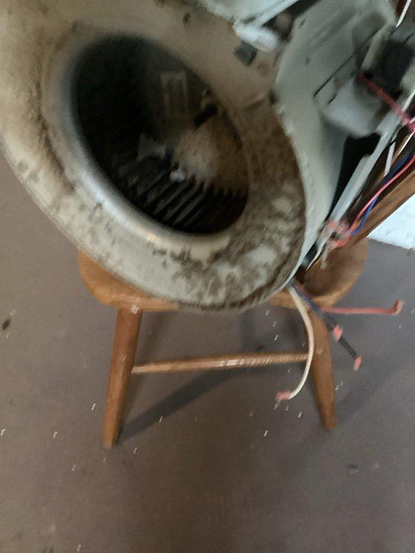 Responded to no-heat call where system would not turn off. Replaced thermostat but unit still failed to produce heat. Inspection revealed 10+ year old furnace with heavily contaminated blower assembly showing significant dust and debris accumulation throughout blower wheel and housing, which may be contributing to system malfunction and requires further diagnostic work or replacement consideration.