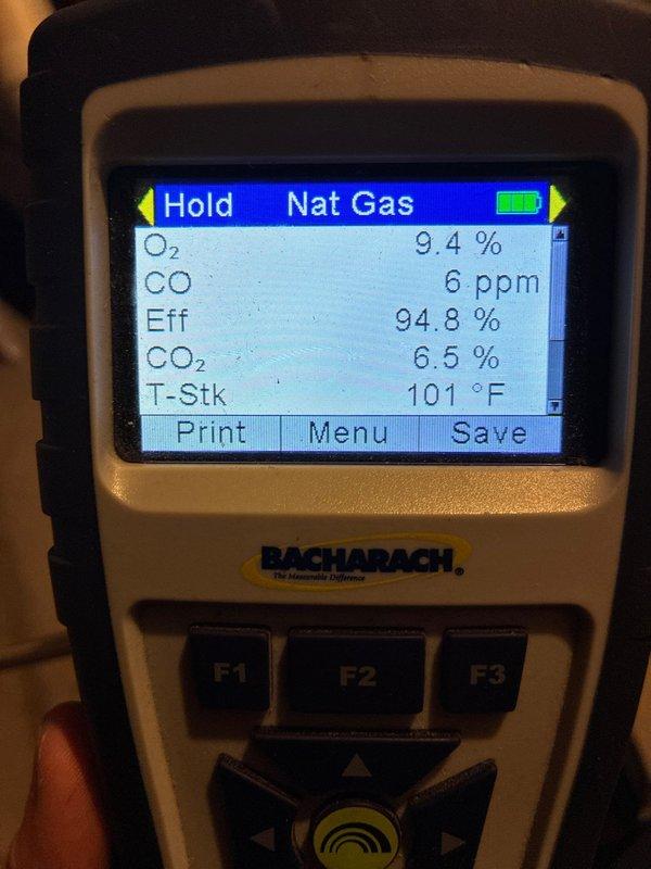 Completed comprehensive tune-up on 1-year-old furnace system. Performed combustion analysis using calibrated gas analyzer, confirming optimal performance with readings of 94.8% efficiency, 6 ppm CO, 9.4% O2, 6.5% CO2, and 101°F stack temperature. All measurements within manufacturer specifications, indicating proper burner operation and heat exchanger function.
