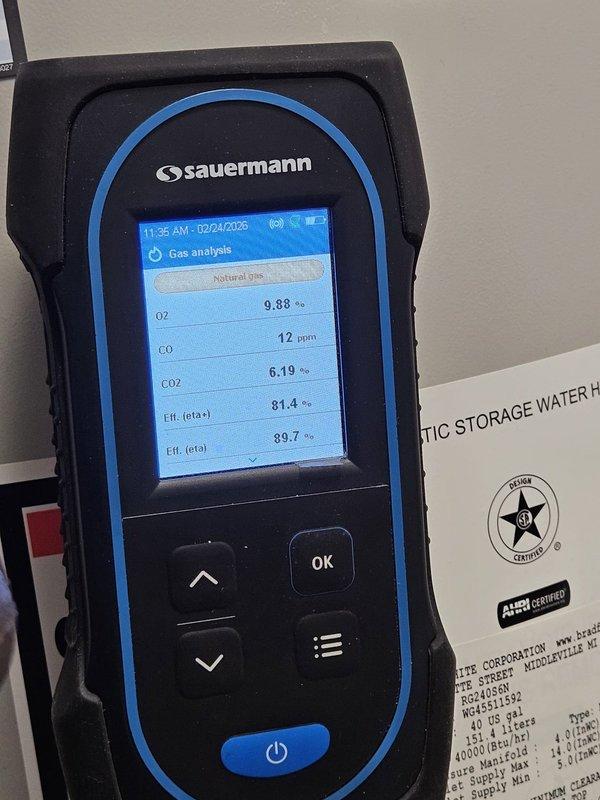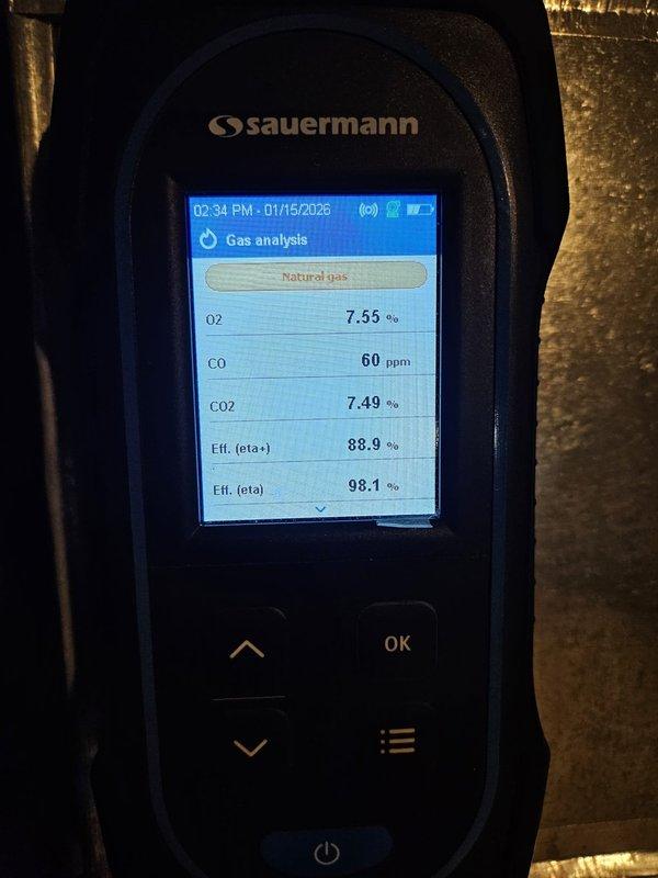 Performed second opinion assessment on furnace with reported heat exchanger issues. Conducted comprehensive combustion analysis using Sauermann gas analyzer, which revealed acceptable readings (O2: 7.55%, CO: 60ppm, CO2: 7.49%) and good efficiency ratings (eta+: 88.9%, eta: 98.1%). Determined heat exchanger is functioning properly with no evidence of failure.