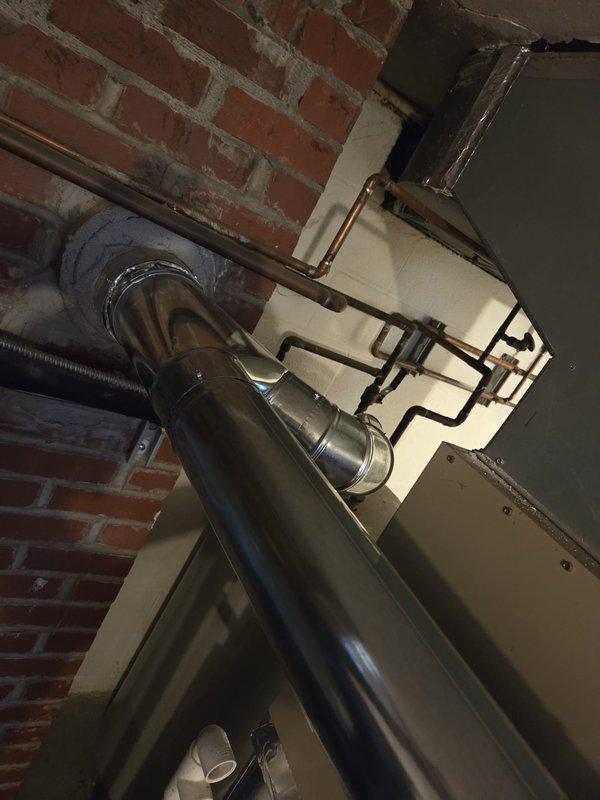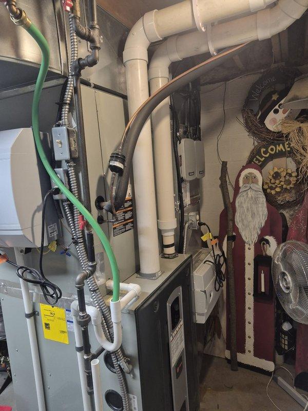 Completed installation of new furnace system in basement utility area, including proper connection of black metal supply pipe to junction fitting and installation of copper distribution lines along utility wall. All connections were secured and tested, with system functioning as designed with no leaks or issues detected.