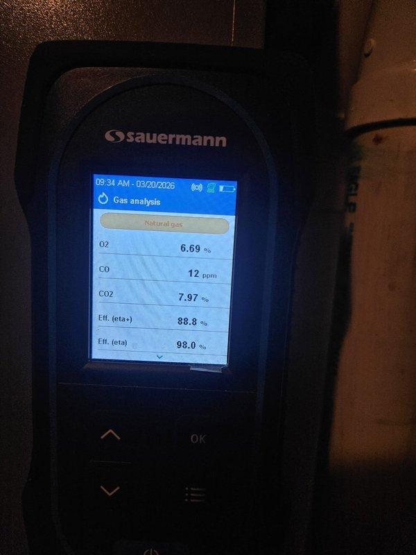 Conducted heating system maintenance service and performed combustion analysis using Sauermann analyzer. Readings showed optimal combustion parameters with O2 at 6.69%, CO at 12 ppm, CO2 at 7.97%, and efficiency ratings of 88.8% (eta+) and 98.0% (eta), confirming the unit is operating within manufacturer specifications.