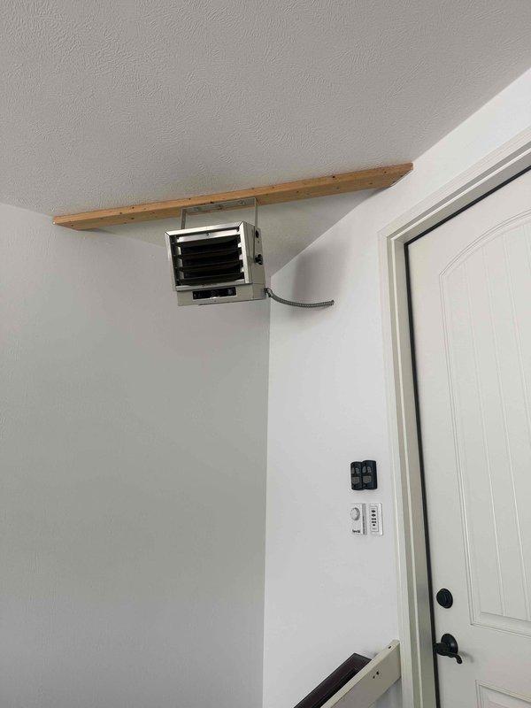 Responded to service call for non-operational garage heater and upstairs AC unit. Inspected wall-mounted electric heating unit in garage, verified electrical connections and thermostat operation, and restored proper functionality. Accessed rooftop AC unit via ladder, performed diagnostic evaluation, and completed necessary repairs to return system to normal operation.