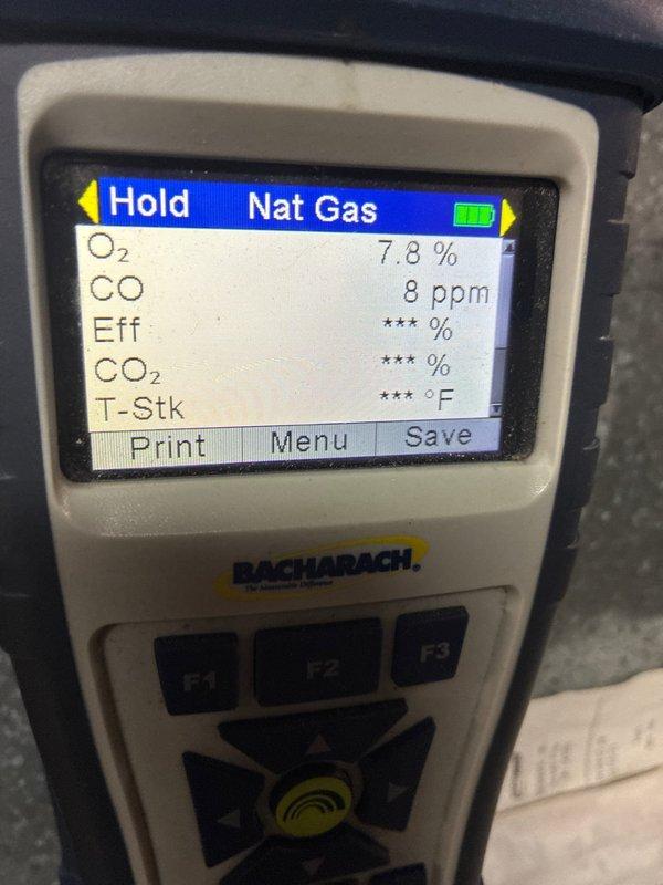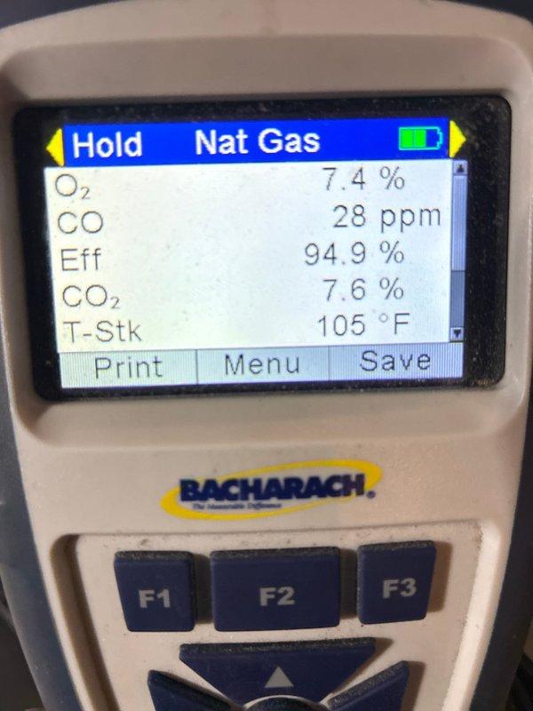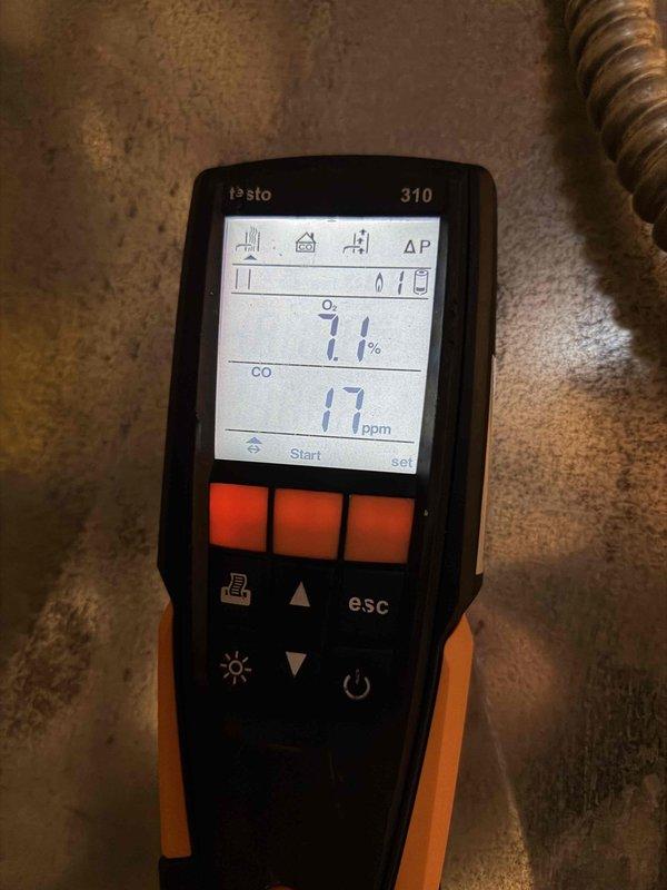 Performed maintenance on gas furnace of undetermined age with MVP component. Conducted combustion analysis using Testo 310 analyzer, which measured oxygen (O₂) levels at 7.1% and carbon monoxide (CO) at 17 ppm, indicating proper combustion within safety parameters.