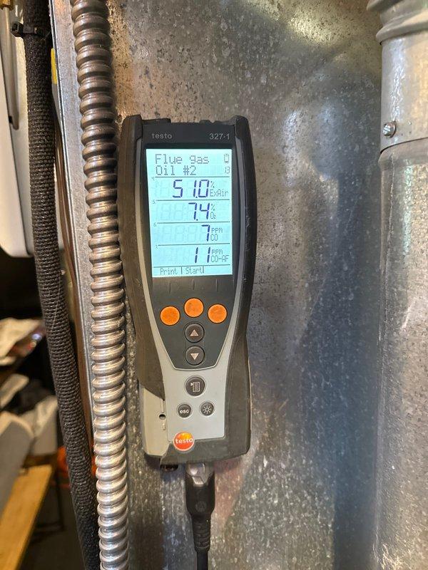 Responded to no heat complaint. Performed combustion analysis using Testo 327-1 analyzer on oil furnace. Testing revealed 74% efficiency with proper oxygen levels at 5.10%, indicating system is now operating within normal parameters.