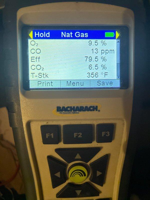 Performed scheduled maintenance on 20-year-old heating system under maintenance contract. Conducted combustion analysis using Bacharach analyzer, which revealed system operating at 79.5% efficiency with 13 ppm CO, 9.5% O2, 6.5% CO2, and stack temperature of 356°F. System will remain under maintenance protection plan until 2026.
