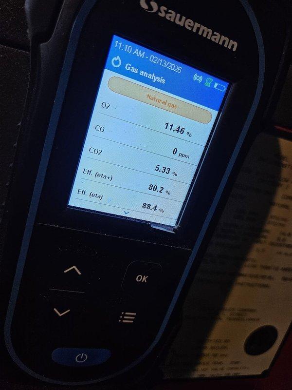 Responded to no-heat call where furnace burner was operational but circulation pump failed to activate. Performed combustion analysis with Sauermann analyzer, confirming proper gas combustion with 80.2% efficiency, 11.46% O2, 0 ppm CO, and 5.33% CO2. Restored proper operation by repairing circulation pump issues.