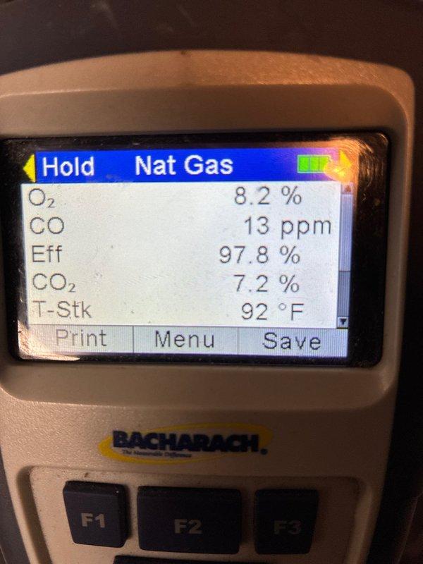 Performed fall maintenance on heating system. Conducted combustion analysis using Bacharach analyzer which confirmed optimal system performance with 97.8% efficiency, CO at 13 ppm, and stack temperature at 92°F. All parameters within normal operating ranges.