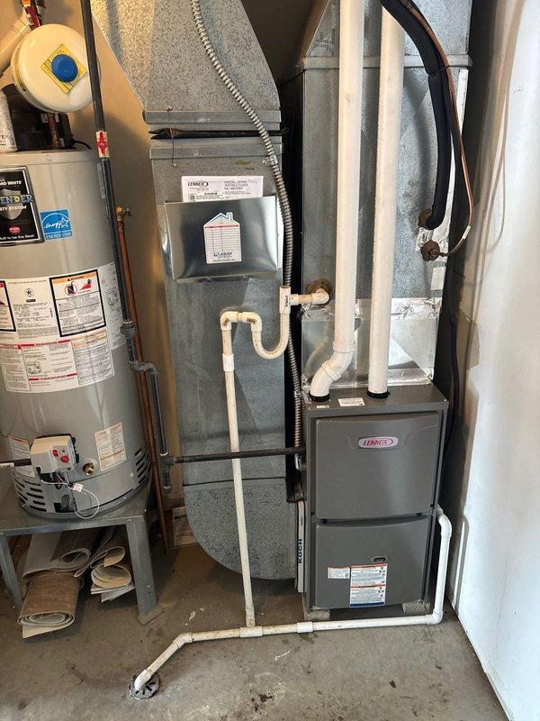 Successfully installed a new Lennox furnace unit in residential mechanical room, connecting it to existing ductwork and ensuring proper integration with the home's water heater system. All PVC drain lines and refrigerant connections were properly secured, with the complete system tested for optimal performance.