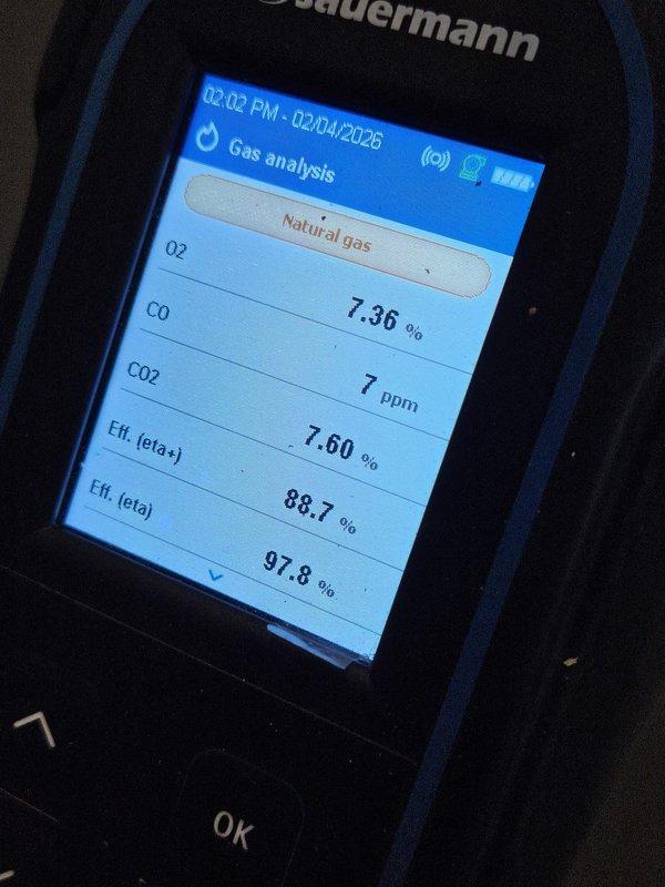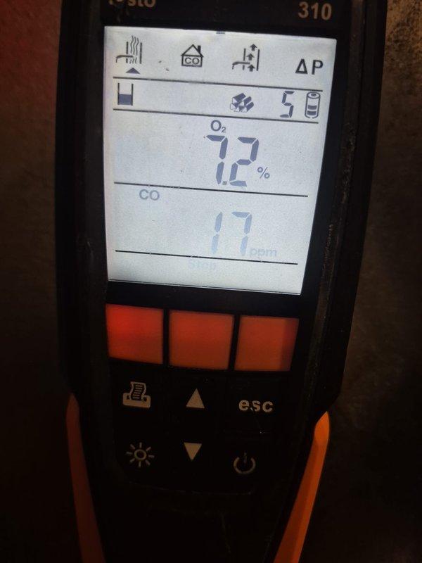 Performed combustion analysis on heating system using Testo 310 analyzer, which revealed oxygen (Oâ‚‚) levels at 7.2% and carbon monoxide (CO) at 17 ppm. These readings indicate acceptable combustion efficiency, resolving the no-heat complaint after necessary adjustments were made to restore proper system operation.