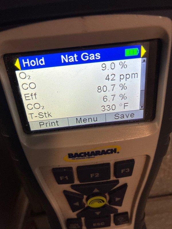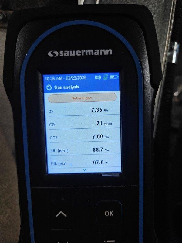 Performed scheduled furnace maintenance and conducted combustion analysis using Bacharach gas analyzer. Readings showed system operating at 80.1% efficiency with Oâ‚‚ at 8.3%, CO at 34 ppm, COâ‚‚ at 7.1%, and stack temperature at 378°F.