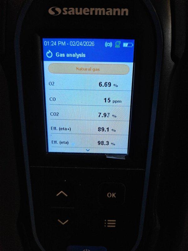 Performed routine residential heating maintenance service. Conducted combustion analysis using Testo 310 analyzer, which showed O2 levels at 8.1% and CO at 5 ppm, indicating proper combustion within acceptable safety parameters.
