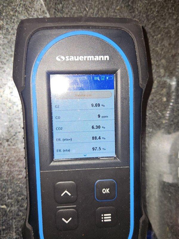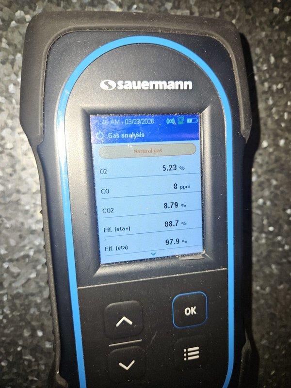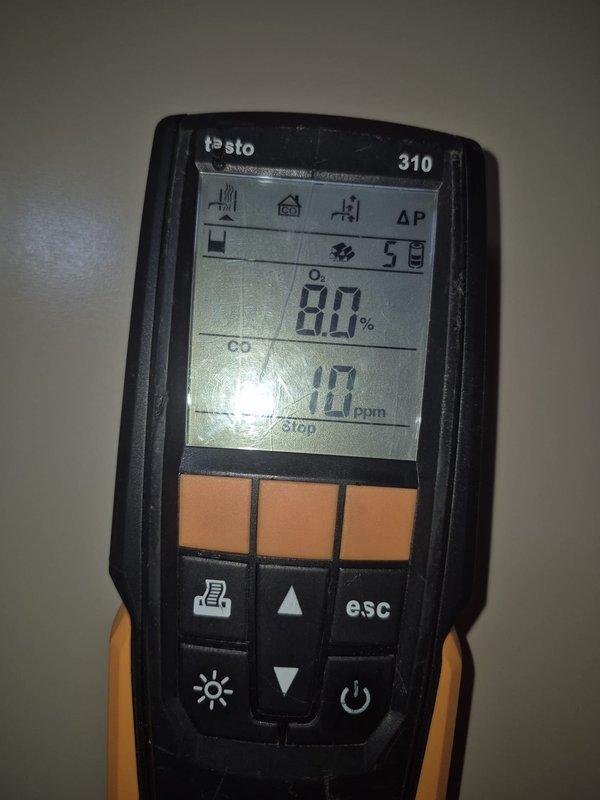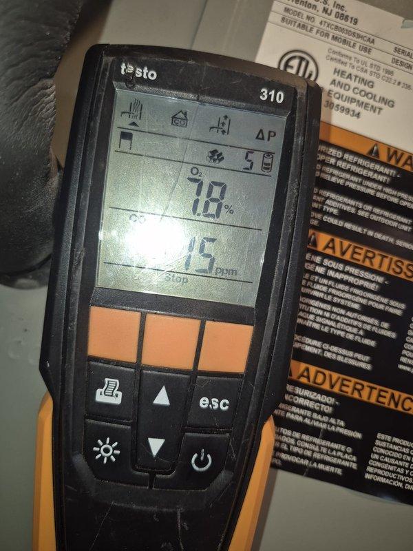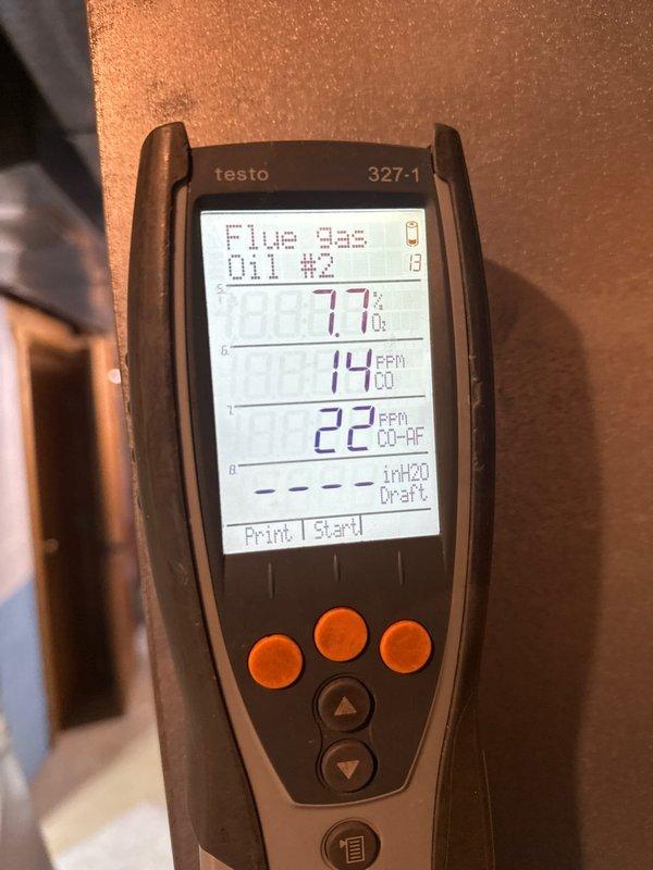 Responded to no-heat call for 8-year-old furnace system. Performed combustion analysis with Testo 327-1 analyzer, confirming proper oxygen levels at 7.7% and safe carbon monoxide readings (CO at 14 PPM, CO-H2 at 22 PPM). Restored heating functionality and verified safe operation before departure.