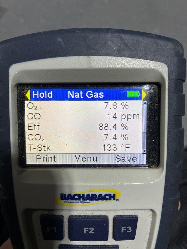 Performed comprehensive furnace tune-up on unit of undetermined age. Conducted combustion analysis using Bacharach analyzer, which showed system operating at 88.4% efficiency with acceptable CO levels (14 ppm), oxygen at 7.8%, and stack temperature of 133°F, indicating proper combustion parameters.