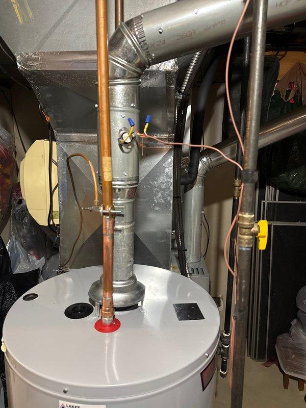 Performed inspection and verification of hot water tank and furnace operation in conjunction with Tjernlund exhaust system. Confirmed proper venting configuration through metallic ductwork assembly, verified all connections between water heater, furnace, and exhaust components are secure and functioning as designed. System operational with no issues identified.