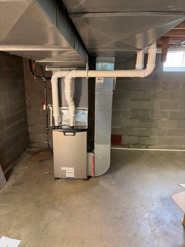 Completed full HVAC system replacement in basement mechanical room, installing new Lennox furnace unit with integrated ductwork connections. Configured sheet metal supply ducts and flexible return ducting, ensuring proper airflow distribution throughout the residence. All equipment mounted, secured, and tested for operational functionality per manufacturer specifications.