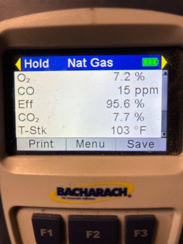 Performed scheduled furnace maintenance on a residential heating system with MVP package. Conducted combustion analysis using Bacharach analyzer, confirming excellent efficiency at 95.6% with safe CO levels (15 ppm) and proper oxygen/carbon dioxide readings (Oâ‚‚ 7.2%, COâ‚‚ 7.7%) at operating temperature of 103°F stack temperature.